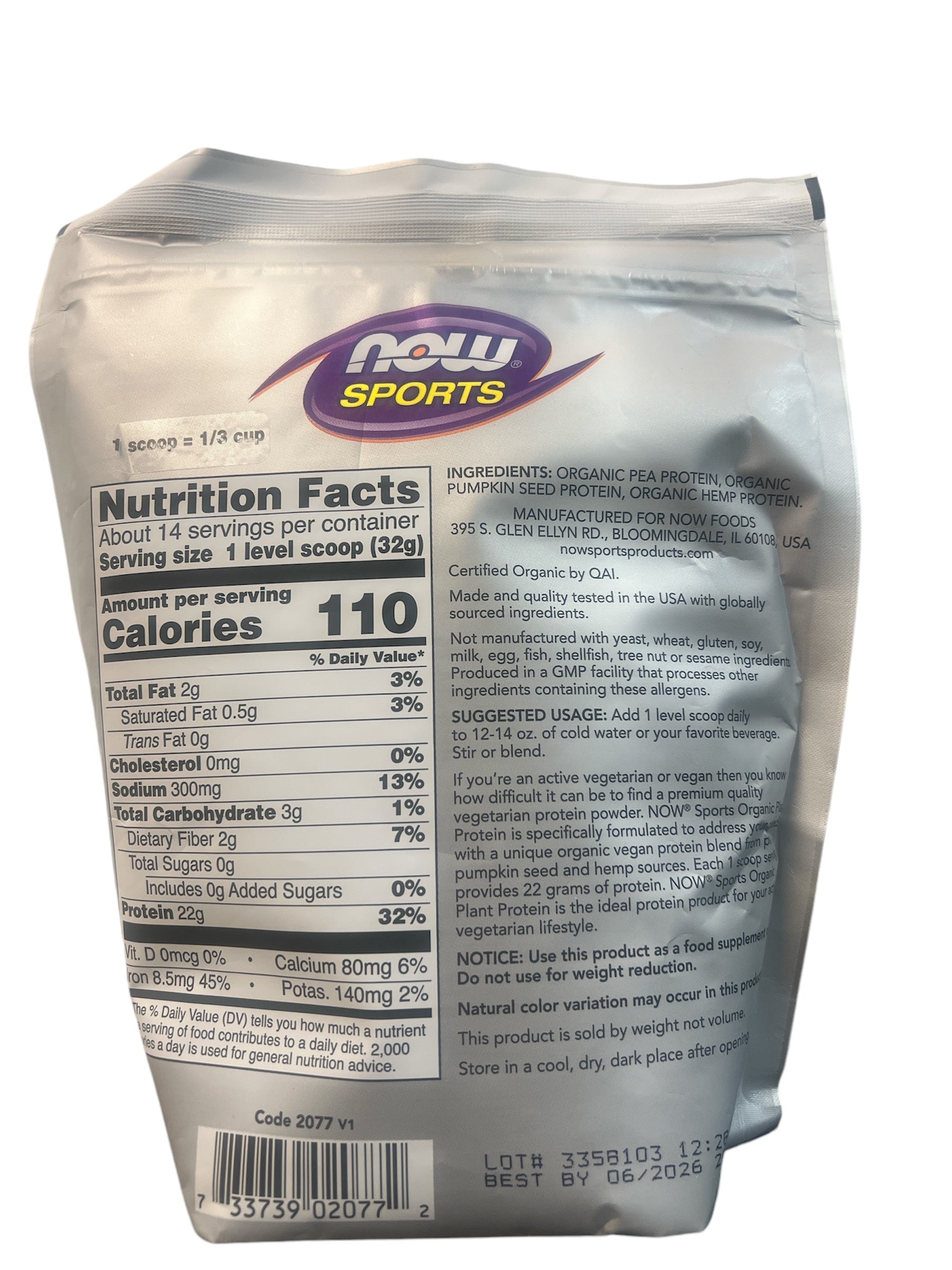 If you're an active vegetarian or vegan then you know how difficult it can be to find a premium quality vegetarian protein powder. NOW® Sports Organic Plant Protein is specifically formulated to address your needs with a unique organic vegan protein blend from pea, pumpkin seed and hemp sources. Each 1 scoop serving provides 22 grams of protein. NOW® Sports Organic Plant Protein is the ideal protein product for your active vegetarian lifestyle.